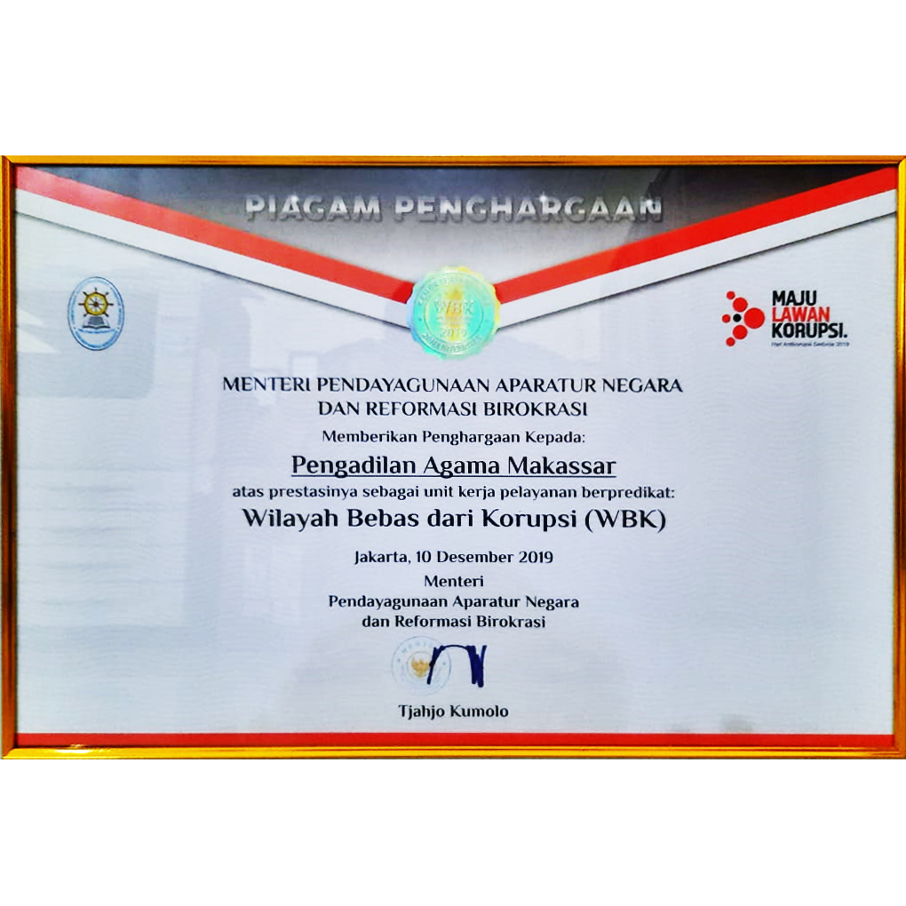 Pengadilan Agama Makassar mendapat Piagam Penghargaan Zona Integritas Wilayah Bebas Dari Korupsi (WBK) dari Menteri Pendayagunaan Aparatur Negara dan Reformasi Birokrasi.