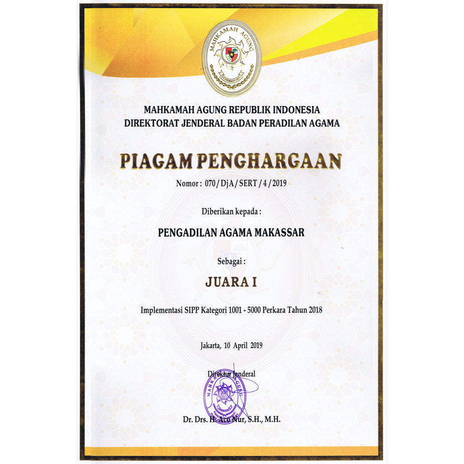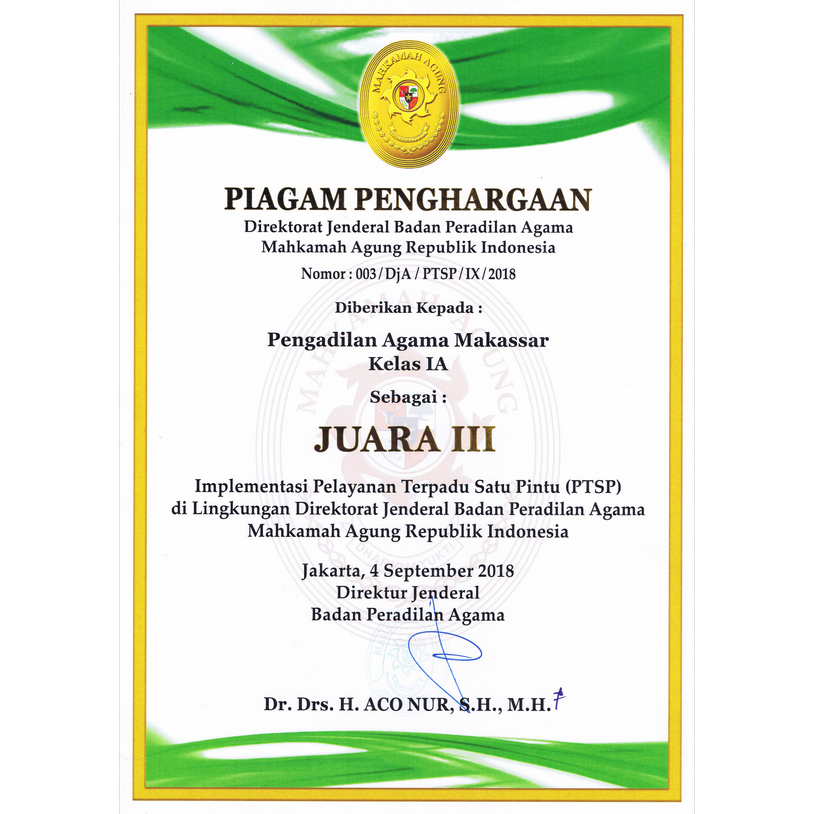 Pengadilan Agama Makassar mendapat Piagam Penghargaan sebagai Juara 3 Impementasi Pelayanan Terpadu Satu Pintu di Lingkungan Direktorat Jenderal Badan Peradilan Agama dari Direktur Jenderal Badan Peradilan Agama Mahkamah Agung Republik Indonesia.