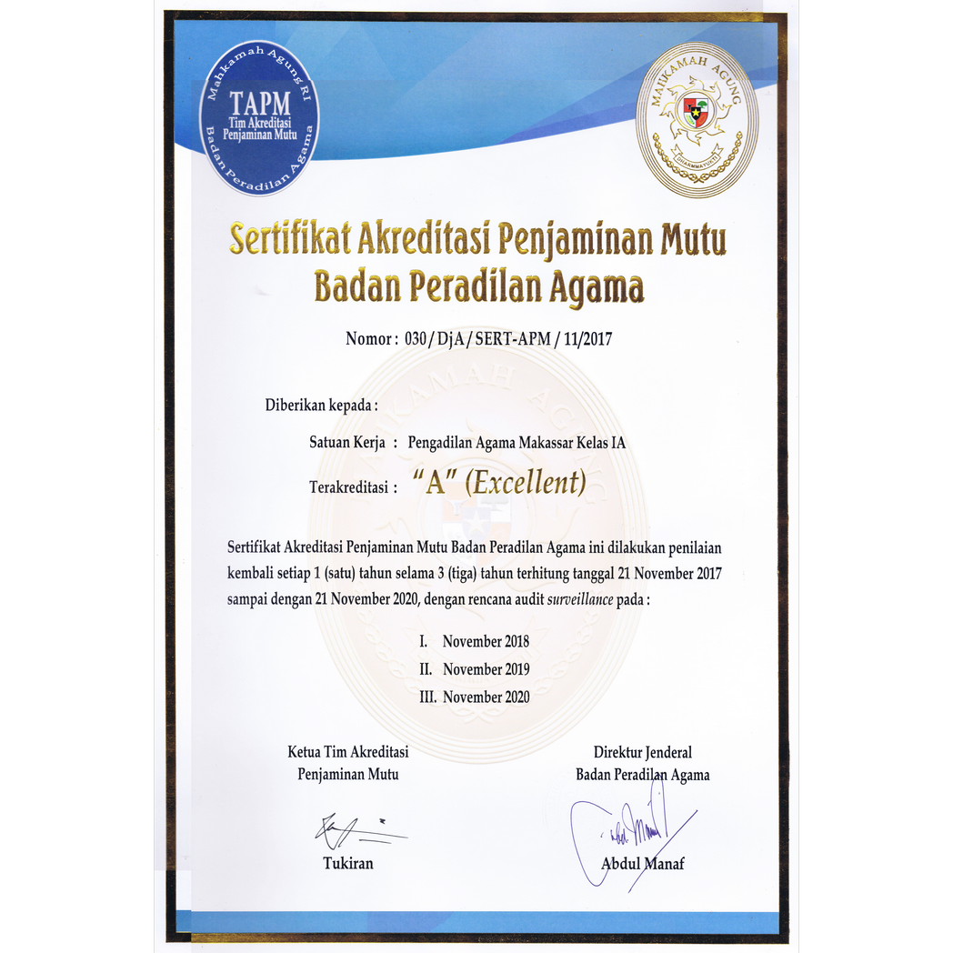 Pengadilan Agama Makassar mendapat Sertifikat Akreditasi Penjaminan Mutu dengan predikat "A" Excellent dari Direktur Jenderal Badan Peradilan Agama Mahkamah Agung Republik Indonesia.